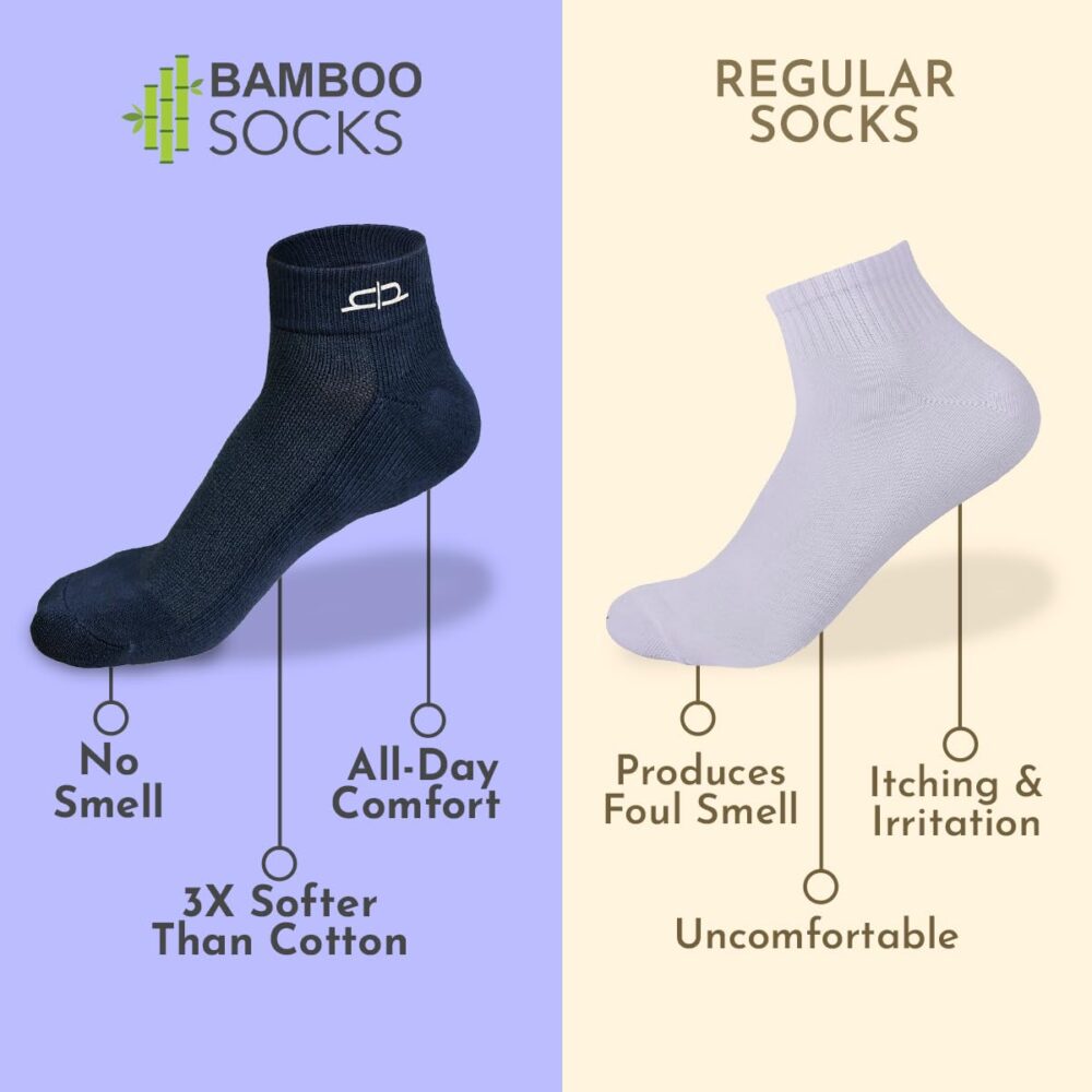 • 🍃 ODOUR FREE: Odour control through the natural anti-bacterial property of bamboo material. Inhibits the growth of odor-causing bacteria that create foul foot smell. It also keeps your feet free from infections. The softness of bamboo fabric prevents friction injuries like rashes and ulcers.