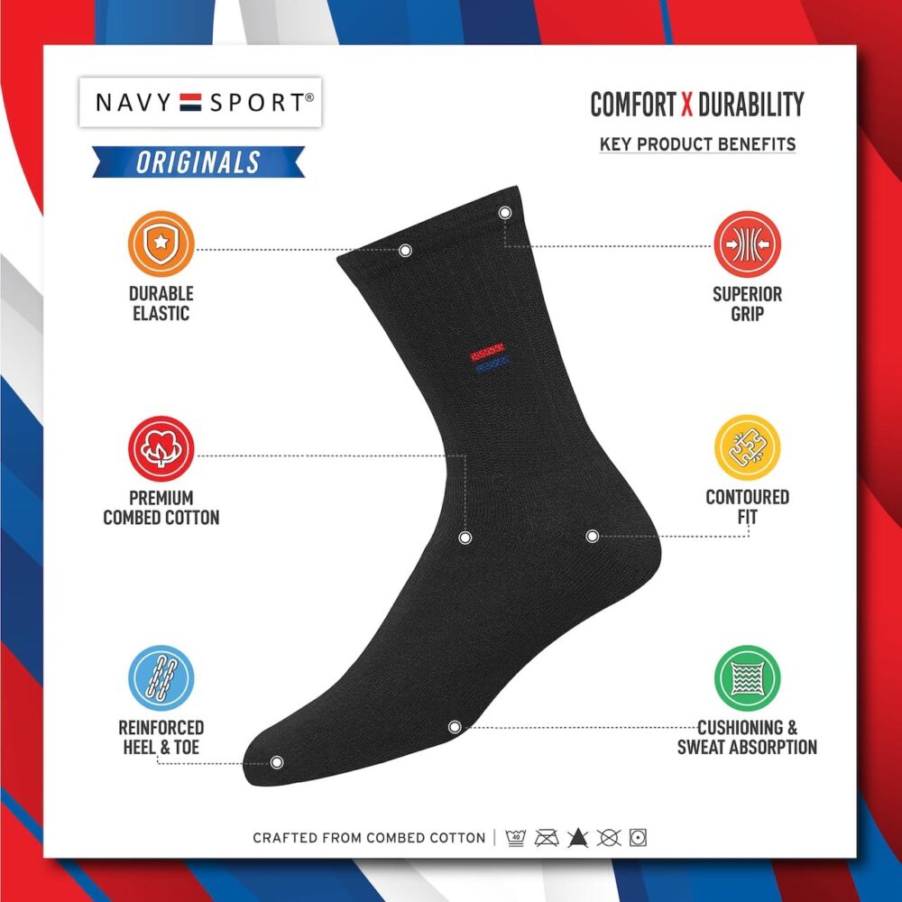 Each pair of Navy Sport socks is crafted from the highest grade combed cotton sourced from the best of class spinning mills in India. A durable elastane produced from imported rubber is used to ensure a firm grip and withstand everyday wear and tear.