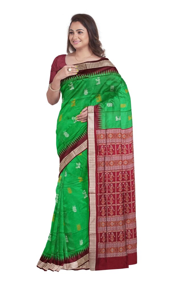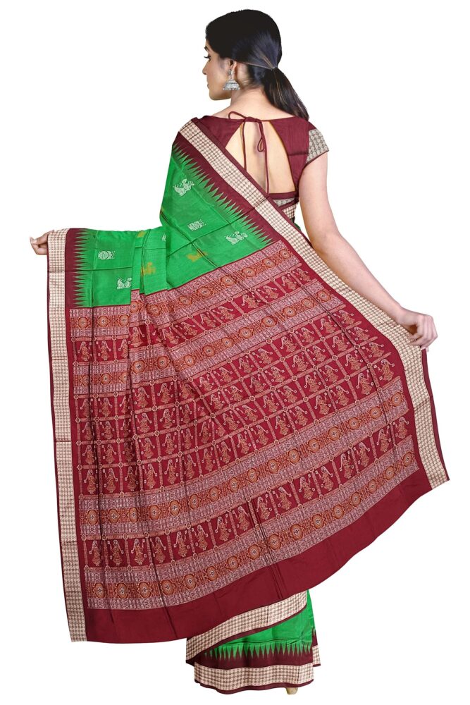 - FABRIC & DESIGN: Authentic Sambalpuri Bomkai silk saree featuring beautiful Aradhana and kalash motifs on a vibrant green colour base with traditional craftsmanship