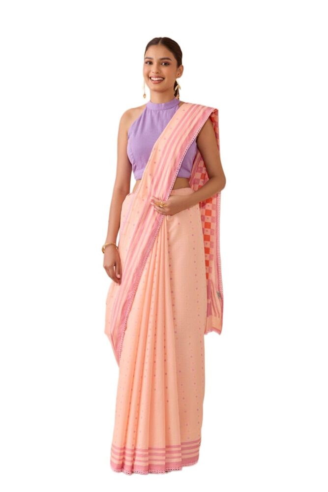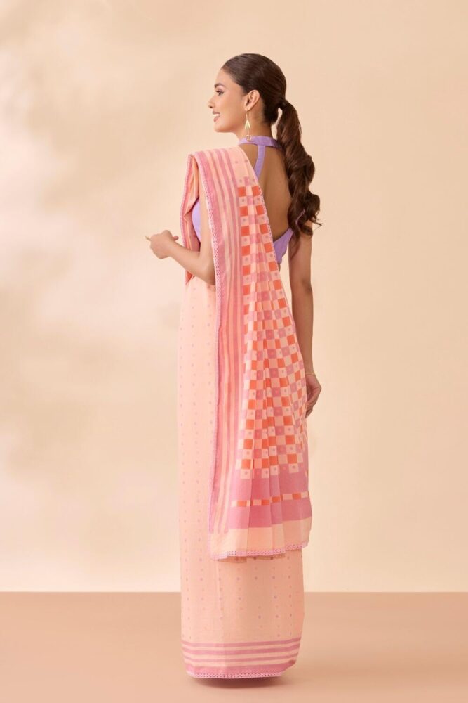 “This light orange Bengal Cotton saree features delicate screen print, combining traditional charm with lightweight, breathable comfort. Its vibrant hue and elegant design make it perfect for festive occasions or casual gatherings. Pair it with a matching or contrasting blouse to create a graceful and stylish ensemble.”
