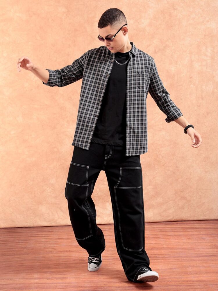 This Spread Collar, Slim Fit, Long Sleeves, Black, Checkered, Premium Cotton Shirt, can be worn on their own or layered with other garments, such as jackets, sweaters or vests. This can be paired with jeans, trousers depending on the occasion and the desired look.