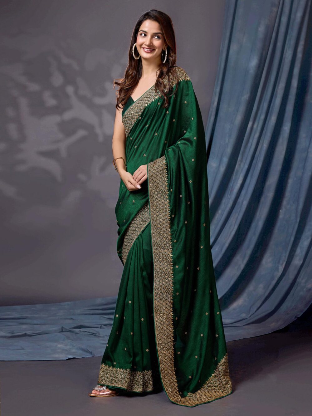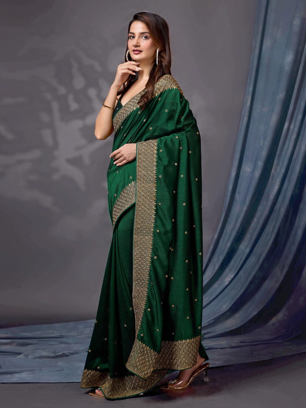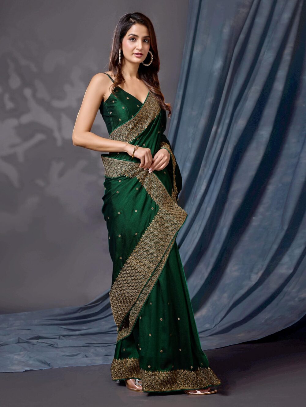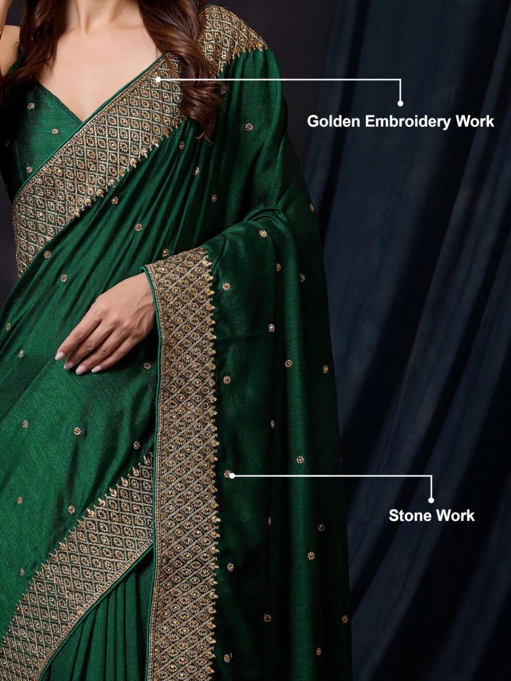 - Color: Saree: Dark Green||Blouse: Dark Green